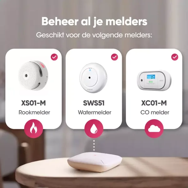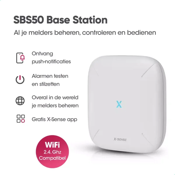 Het SBS50 Basisstation fungeert als een gateway die via je eigen WiFi-netwerk gekoppeld wordt aan compatibele slimme X-Sense melders, zoals de XS01-M rookmelder, XC01-M koolmonoxidemelder en SWS51 Watermelder. Dankzij deze draadloze connectiviteit kun je al je melders beheren en bewaken vanaf één centrale locatie.